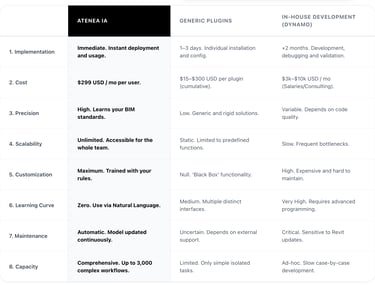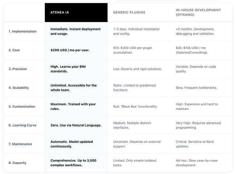 Revit isn’t just about documentation. Atenea also supports the other two major areas—modeling and reviews. Step by step, we’re taking control of the entire Revit workflow.